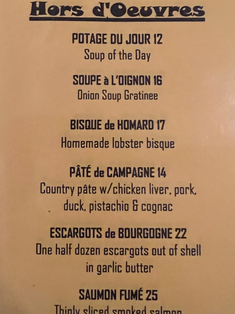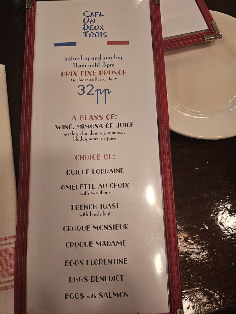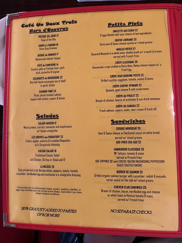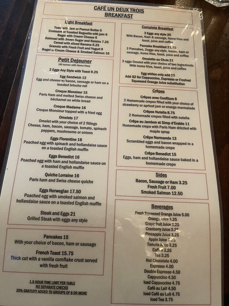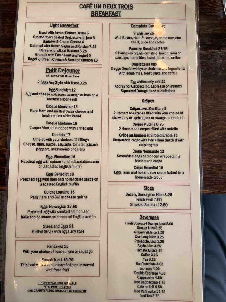 Introducing the menu at Cafe Un Deux Trois, a French-inspired eatery located in New York City. Offering a variety of options for breakfast, brunch, and desserts, this restaurant is a must-visit for those looking to indulge in classic French cuisine. From the rich and creamy soups to the flavorful salads and savory omelets, Cafe Un Deux Trois has something for every palate. Their attention to detail and use of high-quality ingredients shine through in each dish, making for a truly delightful dining experience. Don't miss out on their signature dishes like the Onion Soup Gratinée, Country Pâté, and the Nicoise Salad. With its cozy ambiance and excellent service, Cafe Un Deux Trois is the perfect spot for a casual meal with friends or a special night out. Visit them at 123 W 44th St, New York, NY 10036 or give them a call at (212) 354-4148 to experience a taste of France in the heart of the city.